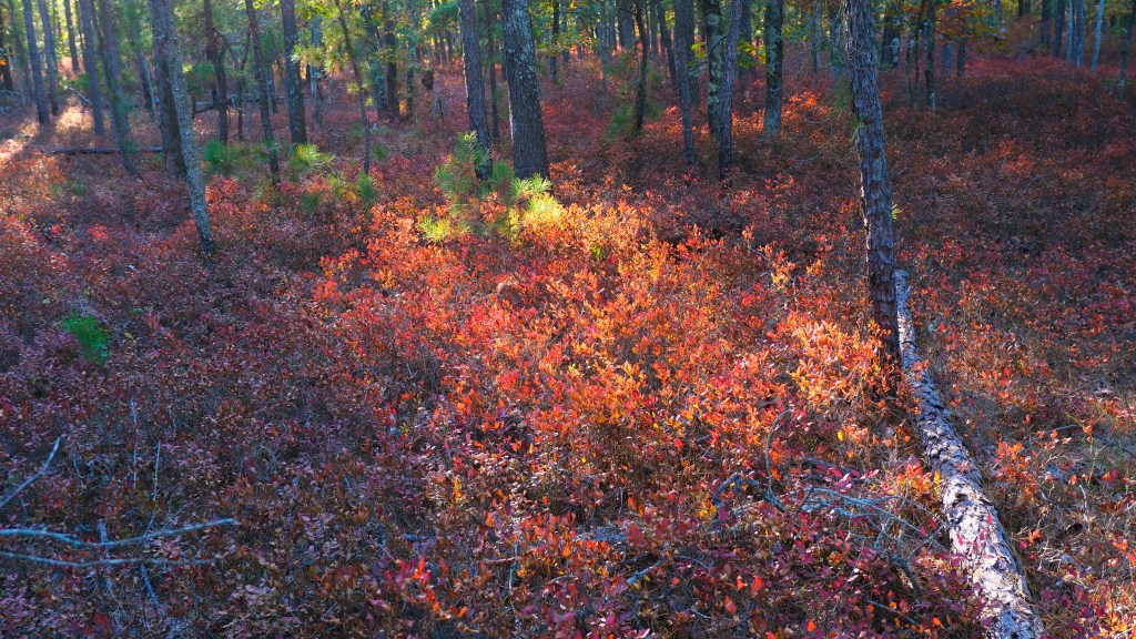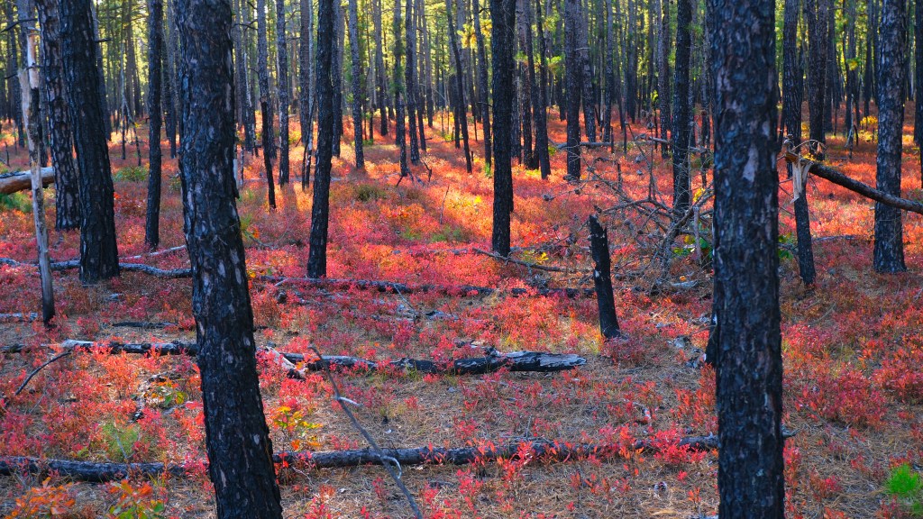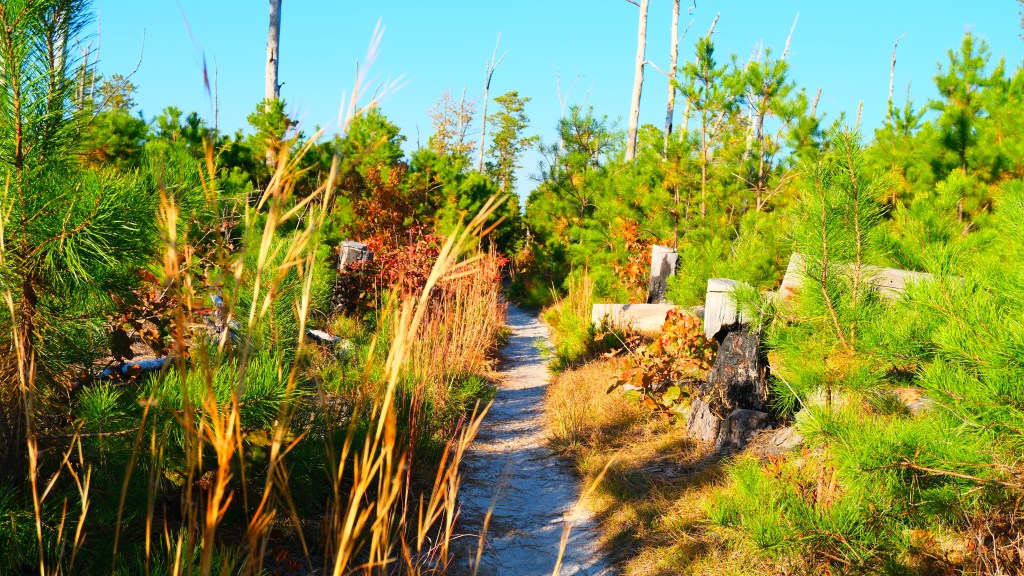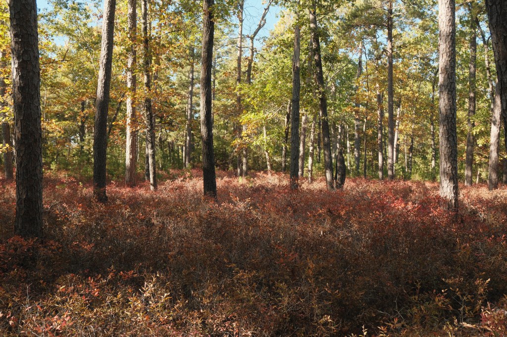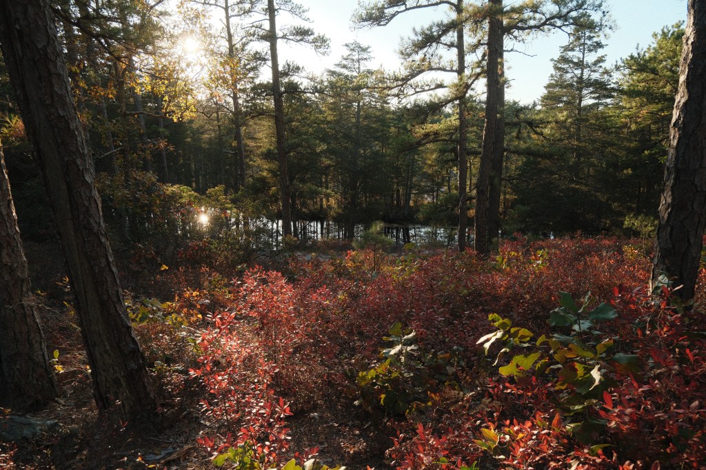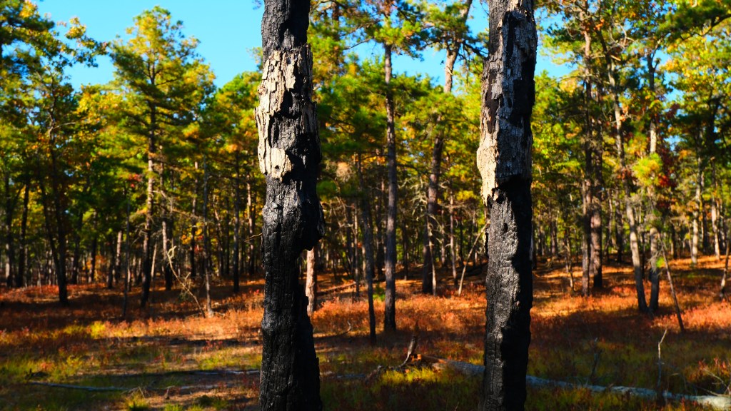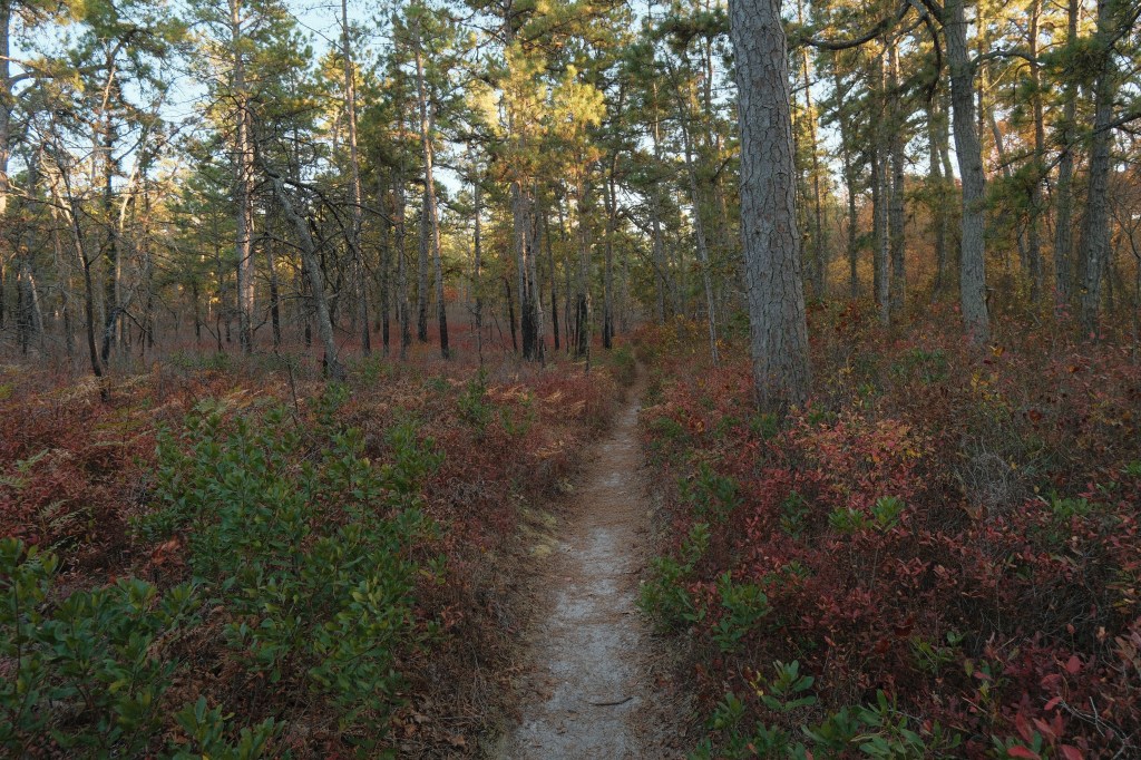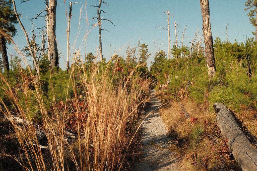 The path is mostly sandy or hard dirt with pine needles. The surrounding forest is filled with blueberry bushes, Sassafras Trees, American Holly and more. There were sections of burn-zone from the great fire in 2012. They had plenty of charred trees. However, there were also many signs of rebirth and new grasses.