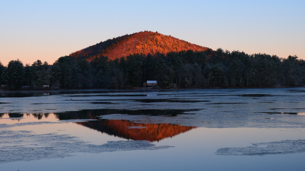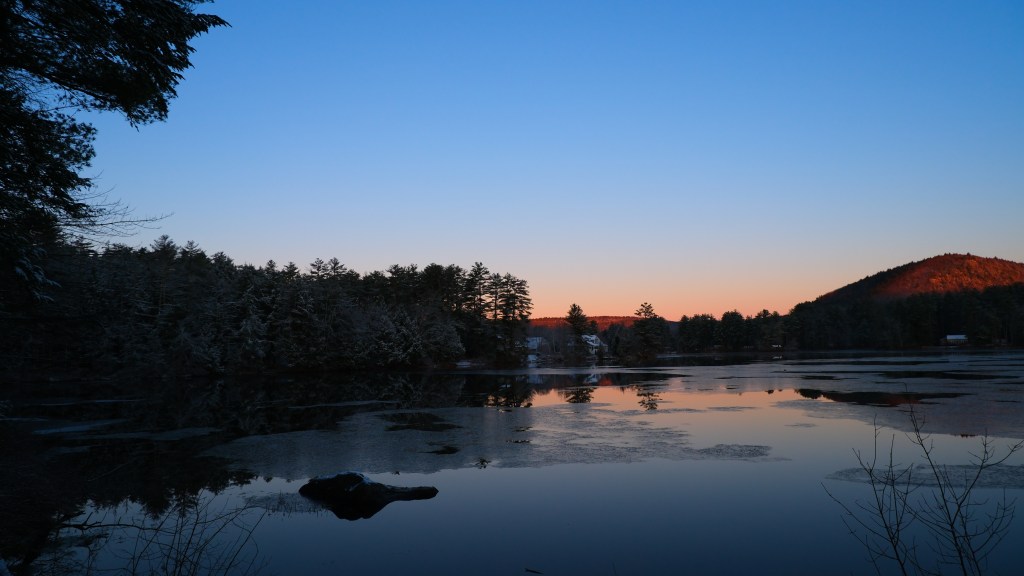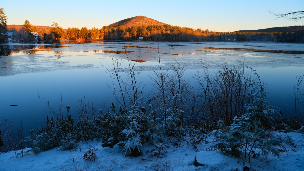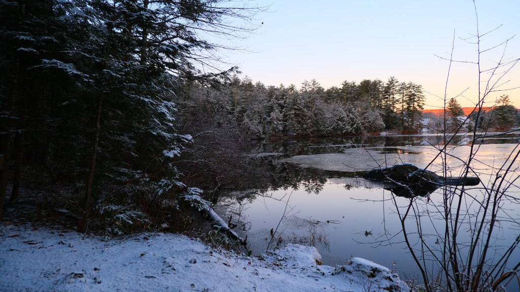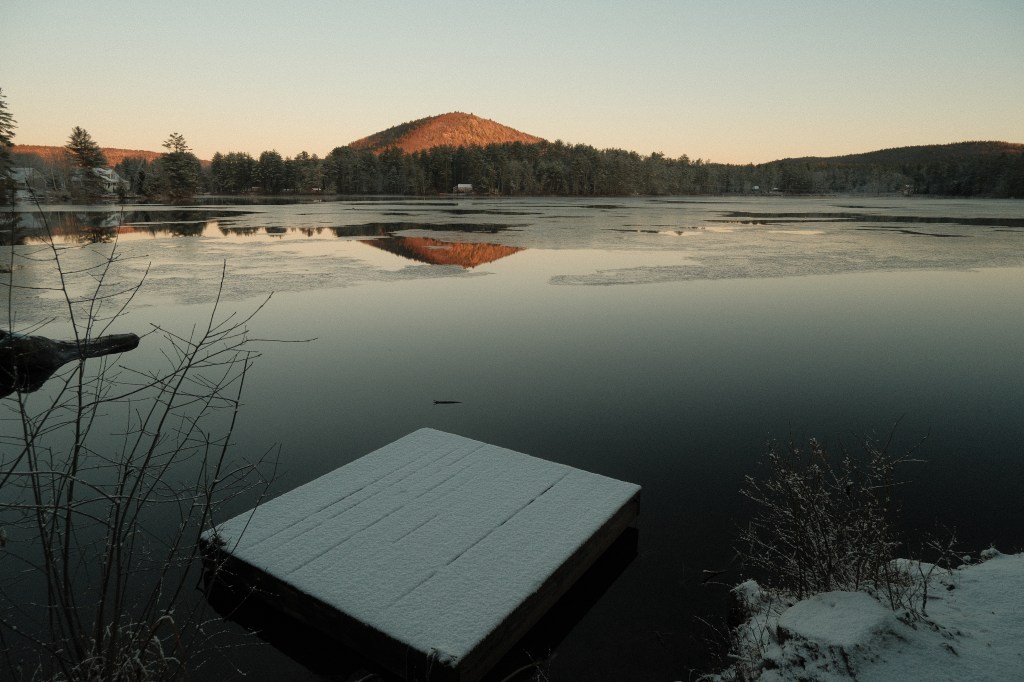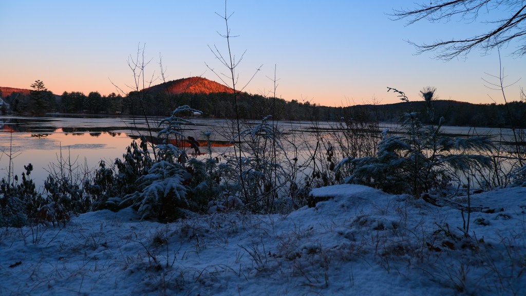 When the sun rose the next morning, the whole area was blanketed in a delicate, soft snow. There was ice on the lake, the naked trees now dressed in a mix of ice and snow. As the sun made her way across the sky, Mt. Tully glowed and reminded us all was good in the world. The air was still crisp. Just like the morning before, I ran out with my camera and phone. I tried to capture it all. I did not want to miss a thing!